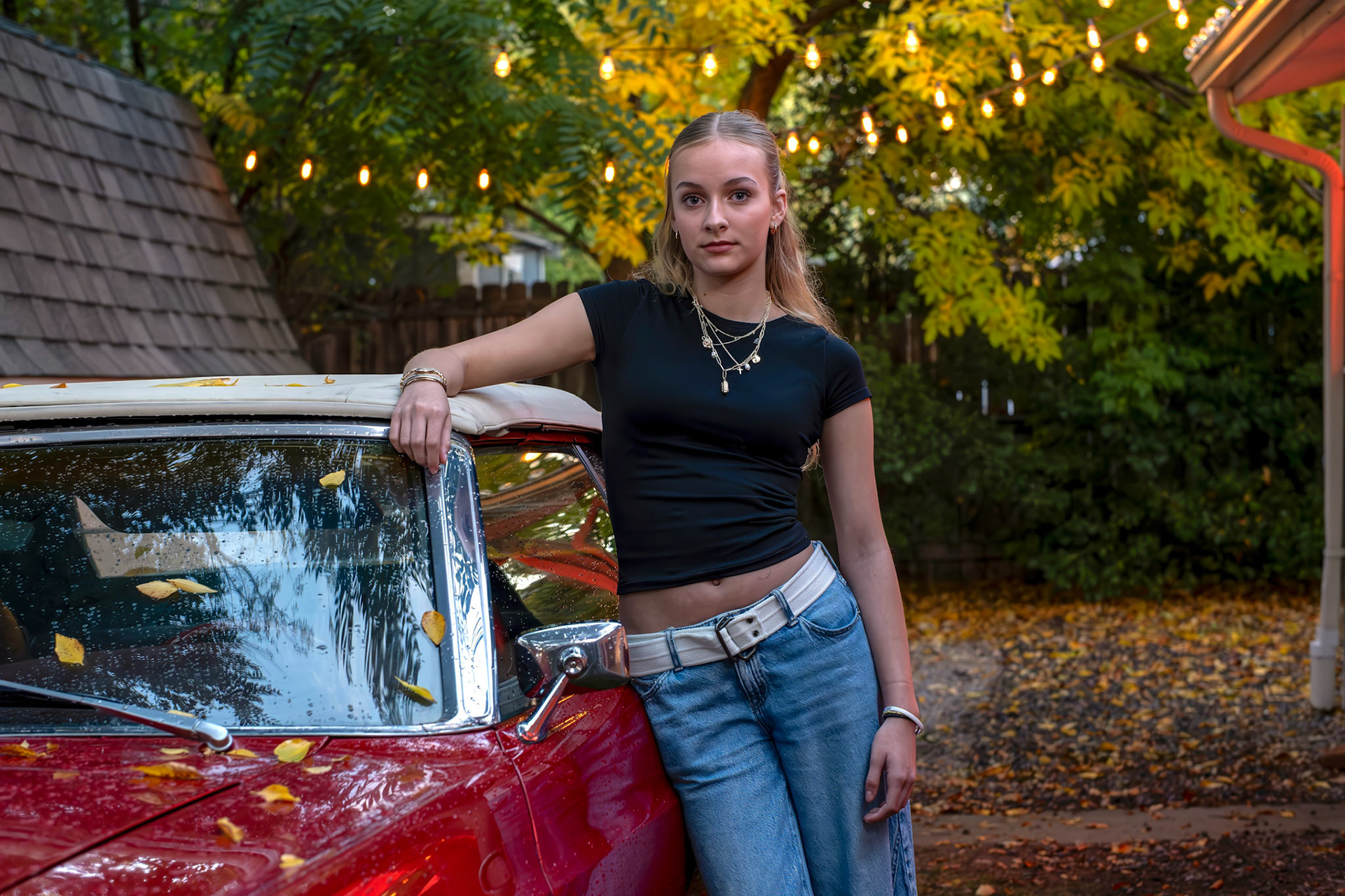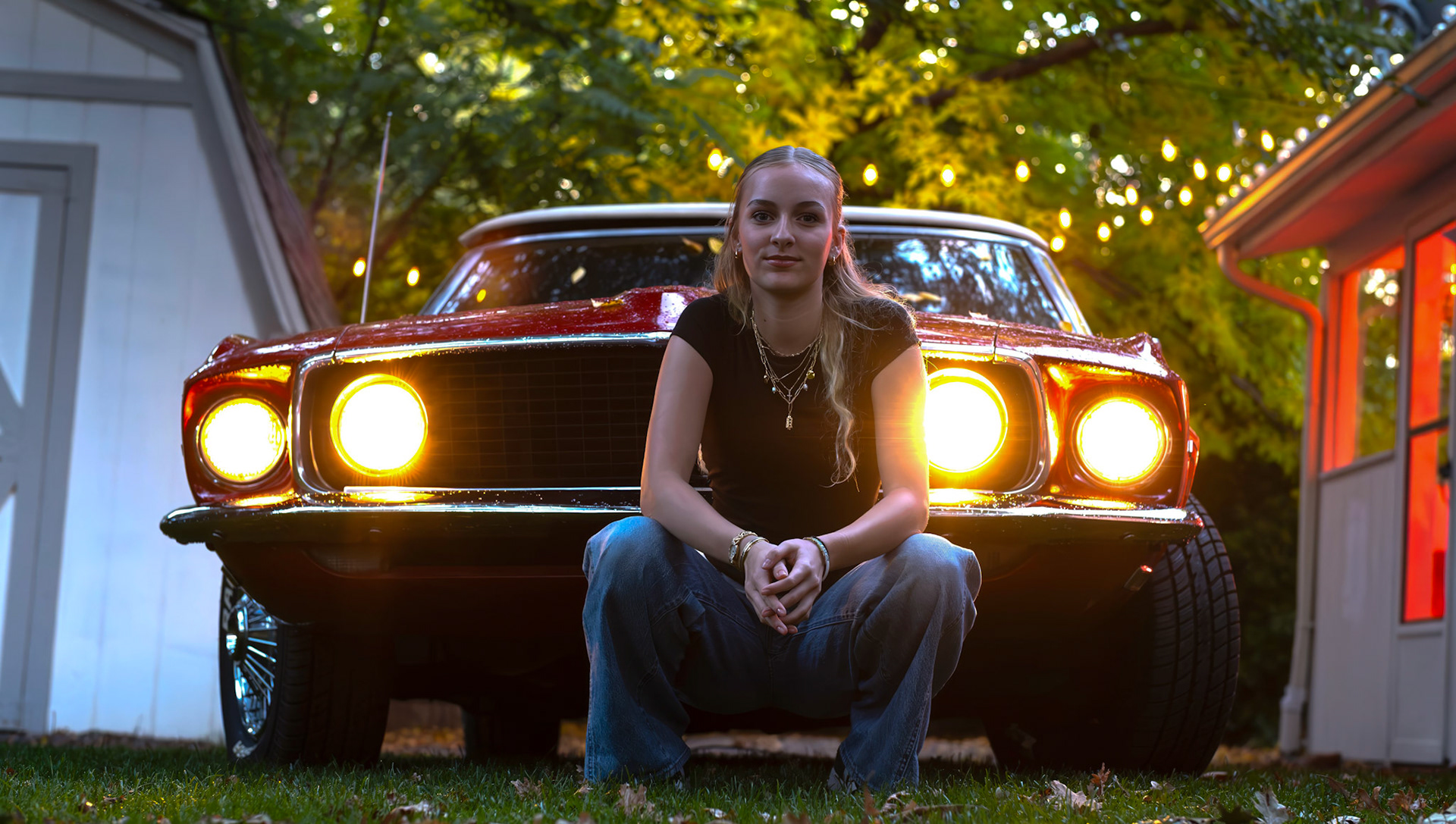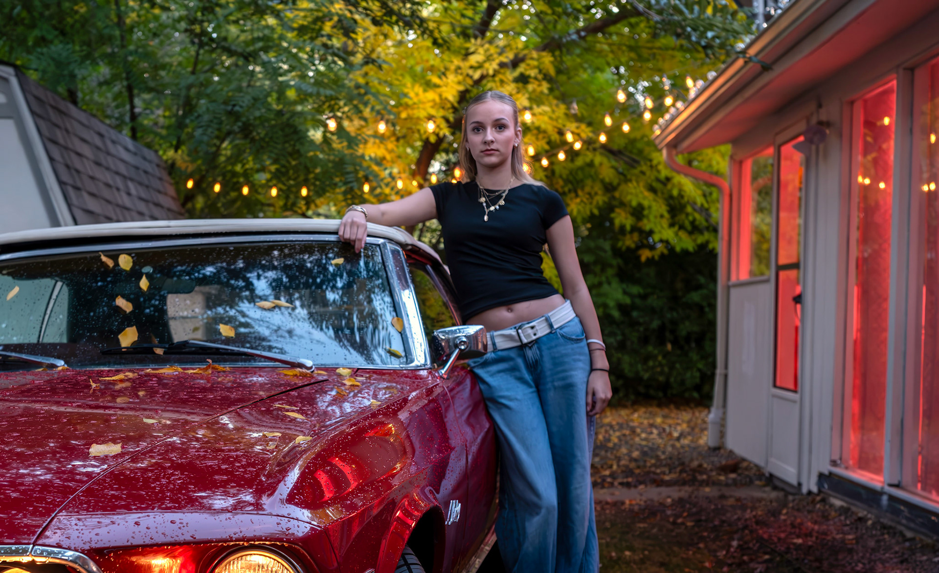 Lūmen isn’t a blank backdrop — it’s a curated collection of rooms and textures. There’s a glass-lined sunroom that changes with the light. A dressing room filled with vintage pieces. A backyard framed by towering trees — and even a red ‘69 Mustang if you're in the mood for something cinematic.